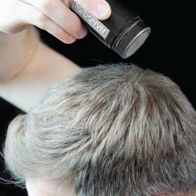 Uprav si vlasy alebo účes ako obvykle. Uchop a nakloň dózu miernym uhlom nad temenom hlavy a ľahkým potriasaním po menších množstvách nanášaj Nanogen vlákna rovnomerne na riedke miesta vo vlasoch.